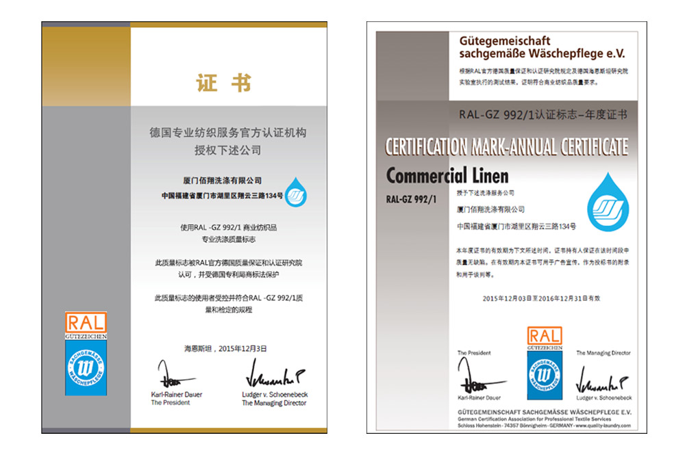 引進(jìn)并執(zhí)行德國具有世界領(lǐng)先水平的針對公共紡織品洗滌租賃服務(wù)企業(yè)的洗滌質(zhì)量標(biāo)準(zhǔn)認(rèn)證(RAL GZ-992),嚴(yán)格進(jìn)行質(zhì)量檢測與全程監(jiān)控。RAL認(rèn)證是針對專業(yè)洗滌公司,評估其紡織品洗滌處理流程,由德國海恩斯坦研究院監(jiān)督審核。日常洗滌工作中,公司注重精益管理。