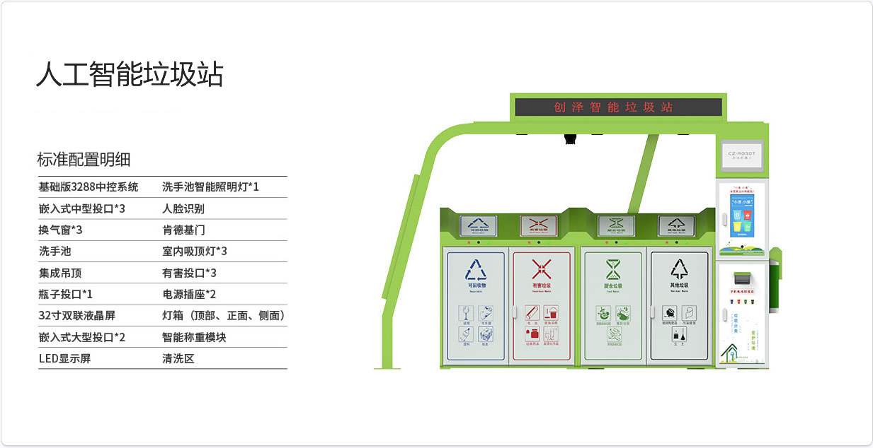 配有19寸顯示屏,擁有語(yǔ)音交互和大屏顯示功能,可廣告投放,具備學(xué)習(xí)、查詢和宣傳垃圾分類相關(guān)知識(shí)等功能。