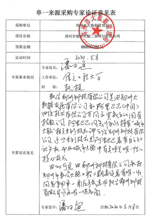 經(jīng)專家論證,認(rèn)為本次采購(gòu)屬于只能從供應(yīng)商處采購(gòu) 情形,我單位擬采用單一來(lái)源采購(gòu)方式選用數(shù)字鄭州科技有限公司作為供應(yīng)商。