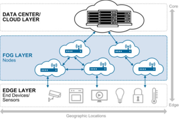 霧計算是一種新興的計算范式,它使計算、存儲、網(wǎng)絡(luò)、加速、分析和管理控制更接近于網(wǎng)絡(luò)的邊緣。它的名字來源于這樣一個事實:云在GG的天空,霧則離地面更近。霧計算的關(guān)鍵是,云(或核心中的企業(yè)服務(wù)器)與物聯(lián)網(wǎng)設(shè)備之間包含一個霧層,如圖1所示。來自物聯(lián)網(wǎng)設(shè)備的事件被發(fā)送到靠近網(wǎng)絡(luò)邊緣的霧節(jié)點。
