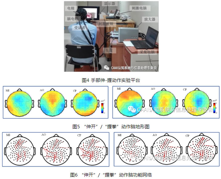 為了提G運動想象動作與所需要的康復肢體的直接相關(guān)性,本課題組設計了手部伸-握動作直接相關(guān)的運動想象和動作觀察相結(jié)合的復合范式實驗,以實現(xiàn)更好的手部主動康復。運動想象是讓受試者去想象某一個動作,不用產(chǎn)生任何肌肉活動,調(diào)動主觀意念在心理上反復模擬或復現(xiàn)相應動作。動作觀察是讓受試者觀看日常生活手的基本動作(如抹桌子、洗衣服等視頻動作),然后盡力去模仿視頻中所出現(xiàn)的動作。通過ERSP(時間相關(guān)譜擾動)、腦地形圖和腦功能網(wǎng)絡計算分析了伸-握動作運動想象和動作觀察對大腦皮層的激活規(guī)律。