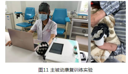 手部主被動訓練系統(tǒng)可分為主動康復和被動康復兩個部分。在主動康復訓練中,對于患者主動意圖的感知有兩種:一種是在多范式刺激大腦皮層的基礎上,從增強的EEG 中直接提取單側(cè)手部伸-握動作精細意圖的EEG 特征,實現(xiàn)對受試者手部動作的精細意圖感知;另一種是發(fā)揮不同模式如EEG、眼電圖(Electrooculogram,EOG)和肌電圖(Electromyogram, EMG)模式的優(yōu)勢,構(gòu)建多模式協(xié)同控制策略以產(chǎn)生更多的控制指令。在被動康復訓練中,通過主動運動意圖產(chǎn)生的控制指令或直接輸入指令對軟體康復手進行驅(qū)動控制,實現(xiàn)軟體康復手輔助手部執(zhí)行康復訓練或進行日常生活。實驗驗證了系統(tǒng)輔助患者在線被動康復訓練,通過正常受試者在線控制康復機械手輔助執(zhí)行伸-握動作,其平均正確率達到92.71%,基本滿足主被動康復訓練的要求,也提升了主被動康復系統(tǒng)的實用化水平。同時,該手部主被動康復訓練系統(tǒng)成功在多家醫(yī)院和兩家企業(yè)進行康復試用。