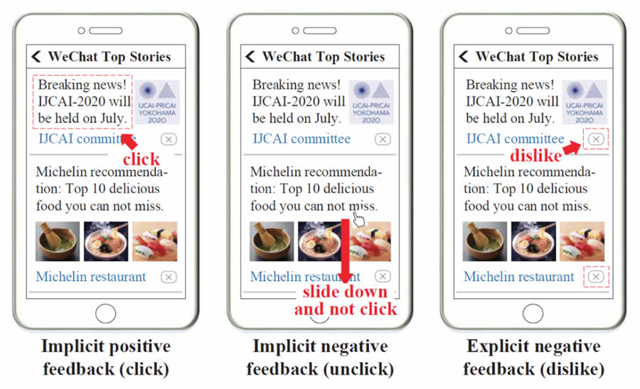 推薦系統(tǒng)在日常生活中被廣泛使用,為用戶獲取信息與娛樂提供便利。推薦系統(tǒng)算法往往基于用戶與系統(tǒng)的交互,這些交互行為可以大致分為以下兩類:顯式反饋與隱式反饋。顯式反饋從用戶對(duì)于物品的直接態(tài)度中獲取,例如評(píng)論中的一星到五星,或者微信看一看系統(tǒng)中的“不感興趣”按鈕。這類反饋能夠直接表達(dá)用戶的正向以及負(fù)向偏好,但是這類反饋的數(shù)量往往不多。隱式反饋從用戶的行為中間接獲得,例如用戶的點(diǎn)擊/不點(diǎn)擊行為。這些信息在推薦系統(tǒng)中往往是海量的,但是這些信息有著較多噪聲(用戶點(diǎn)擊的并不一定是他真正喜歡的)。另外,隱式反饋通常是以正反饋的形式出現(xiàn),推薦中的隱式負(fù)反饋存在巨大噪聲(未展現(xiàn)信息或者未點(diǎn)擊信息并不一定意味著用戶不喜歡這些內(nèi)容)。