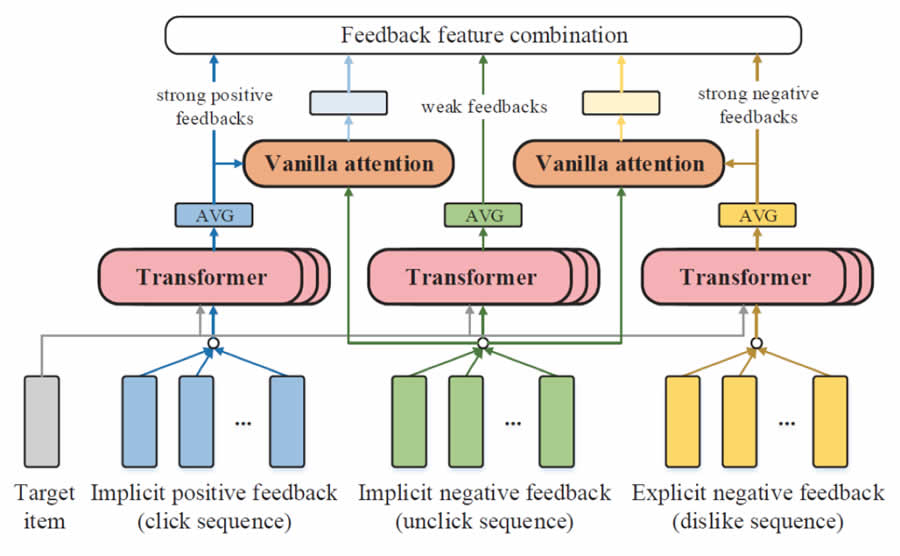 在推薦系統(tǒng)中,用戶的顯式反饋、隱式反饋、正反饋和負(fù)反饋都能夠反映用戶對(duì)于被推薦物品的偏好。這些反饋信息在推薦系統(tǒng)中十分有用。然而,現(xiàn)在的大規(guī)模深度推薦模型往往以點(diǎn)擊為目標(biāo),只看重以用戶點(diǎn)擊行為為代表的隱式正反饋,而忽略了其它有效的用戶反饋信息。
