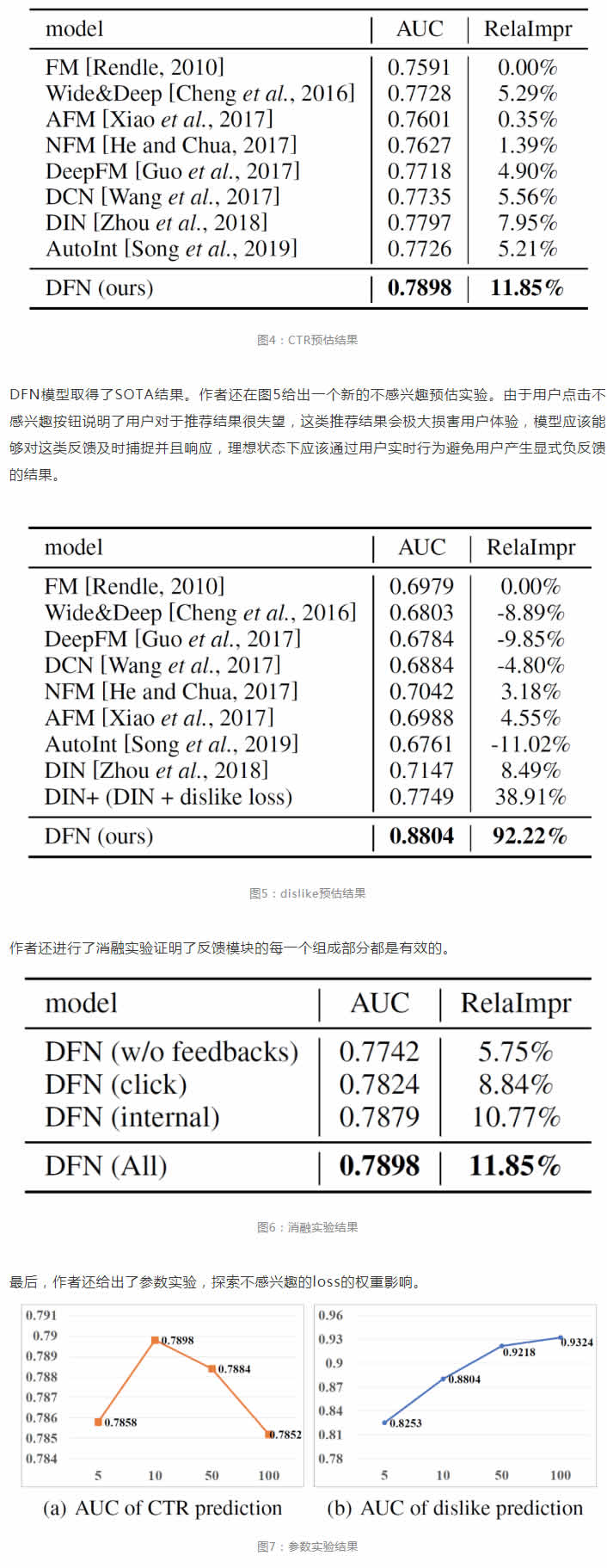 DFN模型使用了internal feedback interaction component抓住用戶行為序列中的細(xì)粒度的行為級(jí)別的交互,然后通過external feedback interaction component,使用準(zhǔn)確但稀少的隱式正反饋和顯式負(fù)反饋?zhàn)鳛楸O(jiān)督,從噪音較多的隱式負(fù)反饋中進(jìn)一步抽取用戶的正負(fù)反饋信息。在實(shí)驗(yàn)中,作者基于微信看一看的數(shù)據(jù),進(jìn)行了豐富的離線和在線實(shí)驗(yàn),模型與baseline相比均取得顯著提升。