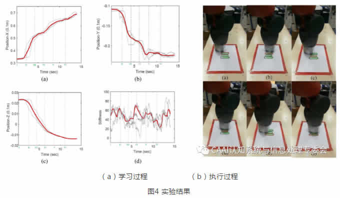 操作者通過Touch X控制Baxter機器人執(zhí)行繪圖任務(wù),整個任務(wù)過程進行3次人機協(xié)作示教,繪圖任務(wù)在一張大小為210mm297mm (A4)的二維空間內(nèi)進行。圖4(a)所示為繪畫任務(wù)的運動軌跡和剛度軌跡;疑為人機協(xié)作繪畫的軌跡,紅色曲線為任務(wù)生成階段的結(jié)果。生成階段可以劃分為6個步驟(I-VI)和三個子任務(wù)。在步驟I和II中,Baxter機器人開始繪圖子任務(wù)1。步驟II和步驟III,Baxter機器人右臂末端離開紙張進行下一次繪圖操作。類似地,子任務(wù)2和子任務(wù)3分別由步驟III到IV和步驟V到VI完成。在任務(wù)學(xué)習(xí)階段,操作者的手臂剛度是隨著繪畫任務(wù)過程的變化而變化。如圖4(b)所示,Baxter機器人采用生成的剛度執(zhí)行繪畫任務(wù)。從圖4(b)中的(a)-(f)可以得出,Baxter機器人利用生成的模型成功的完成了繪圖任務(wù)。