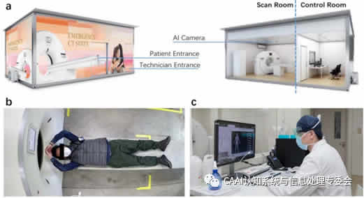 人工智能成像工作流程:許多現(xiàn)代的X光和CT系統(tǒng)都配備了用于病人監(jiān)護(hù)的攝像機(jī)。在COVID-19爆發(fā)期間,這些設(shè)備促進(jìn)了非接觸掃描工作流程的實(shí)施。技術(shù)人員可以通過(guò)攝像機(jī)的實(shí)時(shí)視頻流從控制室監(jiān)控病人。在這種情況下,人工智能能夠通過(guò)從視覺(jué)傳感器獲取的數(shù)據(jù)中識(shí)別患者的姿勢(shì)和形狀來(lái)自動(dòng)執(zhí)行操作,以確定佳掃描參數(shù)。這樣的自動(dòng)化工作流程可以顯著提G掃描效率并減少不必要的輻射暴露。一個(gè)顯著的例子是基于由可視人工智能技術(shù)支持的移動(dòng)CT平臺(tái)自動(dòng)掃描工作流,如圖1(a)所示。移動(dòng)平臺(tái)完全獨(dú)立,帶有基于人工智能的預(yù)掃描和診斷系統(tǒng)。它被重新設(shè)計(jì)成一個(gè)完全隔離的掃描室和控制室,以避免技術(shù)人員和患者之間不必要的互動(dòng)。進(jìn)入掃描室后,通過(guò)視覺(jué)和聽(tīng)覺(jué)提示,指示患者在病床上擺好姿勢(shì)(圖1(b))。技術(shù)人員可以通過(guò)窗戶(hù)觀察,也可以通過(guò)掃描室內(nèi)安裝在天花板上的人工智能攝像機(jī)傳輸?shù)膶?shí)時(shí)視頻,并在必要時(shí)校正病人的姿勢(shì)(圖1(c));颊叨ㄎ凰惴▽挠谜障鄼C(jī)[1]捕獲的圖像中自動(dòng)恢復(fù)患者的3D姿態(tài)和完全重建的網(wǎng)格。基于3D網(wǎng)格,患者目標(biāo)身體部分的掃描范圍和3D中心線都被估計(jì)并轉(zhuǎn)換成控制信號(hào)和優(yōu)化的掃描參數(shù),以供技術(shù)人員驗(yàn)證。一旦核實(shí),病床將自動(dòng)對(duì)準(zhǔn)ISO中心,并移入掃描架進(jìn)行掃描。采集到CT圖像后,將對(duì)其進(jìn)行處理和分析,以便進(jìn)行篩查和診斷。2、AI圖像增強(qiáng)在COVID-19中的具體應(yīng)用