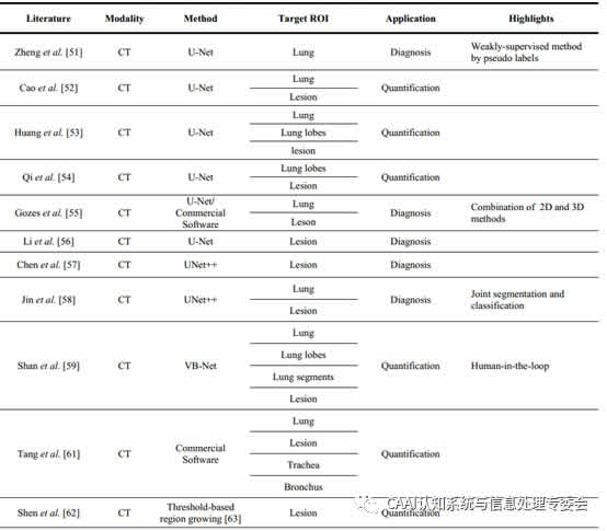 此環(huán)節(jié)的作用在于,對(duì)疑似患者肺部區(qū)域拍攝而得到的圖像進(jìn)行預(yù)處理,以提供后續(xù)操作。實(shí)施層面,此環(huán)節(jié)包含兩部分工作:肺部區(qū)域劃分和損傷區(qū)域。表1是一些圖像劃分在COVID-19應(yīng)用中的研究匯總。