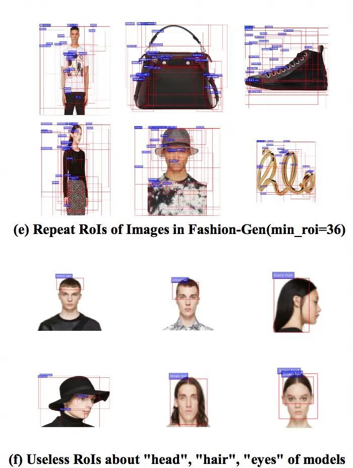 電商圖像產(chǎn)品單一,背景簡單提取 ROI 很少,如圖 1(c)。統(tǒng)計來看,通用L域 MsCoCo 數(shù)據(jù),每張圖像可以提取 19.8 個 ROI,但是電商只能提取 6.4 個 ROI。當(dāng)然我們可以強(qiáng)制提取小的 ROI,比如 ViLBERT 要求在 10~36 個,VLBERT 要求 100 個。但是當(dāng)設(shè)定小提取的 ROI 后,又提取了太多了重復(fù)的 ROI,可以看圖 1(e)。