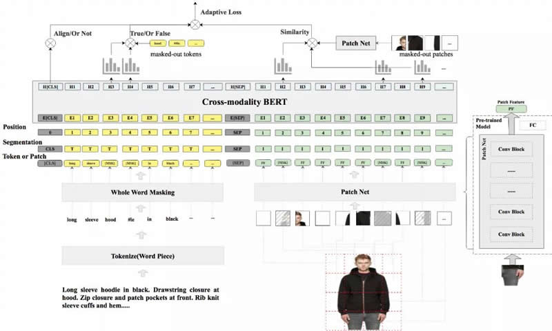 采用預(yù)訓(xùn)練的 BERT 為網(wǎng)絡(luò),這樣語言模型天然包含在 FashionBERT 中。模型可以更加關(guān)注圖文匹配融合。