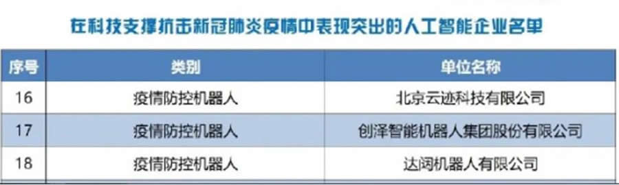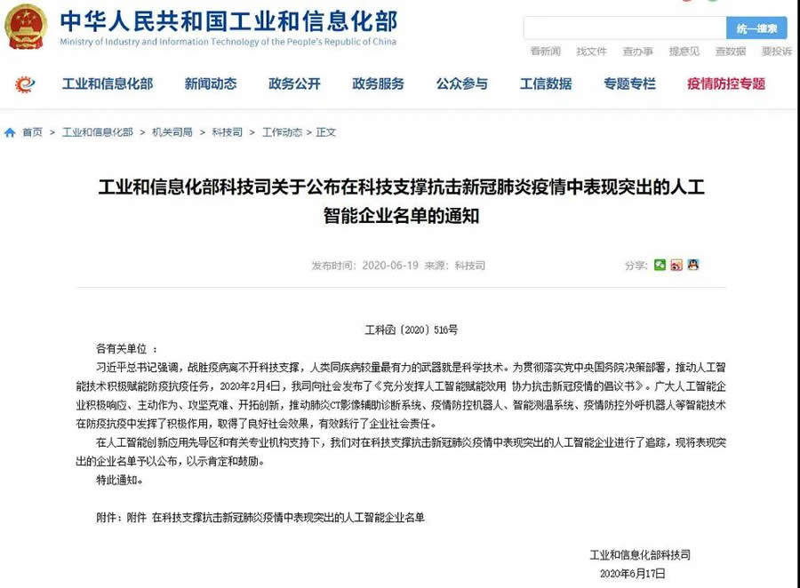 工業(yè)和信息化部科技司 關(guān)于公布在科技支撐抗擊新G肺炎疫情中表現(xiàn) 突出的人工智能企業(yè)名單的通知 工科函﹝2020﹞516號 各有關(guān)單位 : 總書記強(qiáng)調(diào),戰(zhàn)勝疫病離不開科技支撐,人類同疾病較量有力的武器就是科學(xué)技術(shù)。為貫徹落實(shí)黨國務(wù)院決策部署,推動(dòng)人工智能技術(shù)積J賦能防疫抗疫任務(wù),2020年2月4日,我司向社會(huì)發(fā)布了《充分發(fā)揮人工智能賦能效用 協(xié)力抗擊新G疫情的倡議書》。廣大人工智能企業(yè)積J響應(yīng)、主動(dòng)作為、攻堅(jiān)克難、開拓創(chuàng)新,推動(dòng)肺炎CT影像輔助診斷系統(tǒng)、疫情防控機(jī)器人、智能測溫系統(tǒng)、疫情防控外呼機(jī)器人等智能技術(shù)在防疫抗疫中發(fā)揮了積J作用,取得了良好社會(huì)效果,有效踐行了企業(yè)社會(huì)責(zé)任。 在人工智能創(chuàng)新應(yīng)用先導(dǎo)區(qū)和有關(guān)專業(yè)機(jī)構(gòu)支持下,我們對在科技支撐抗擊新G肺炎疫情中表現(xiàn)突出的人工智能企業(yè)進(jìn)行了追蹤,現(xiàn)將表現(xiàn)突出的企業(yè)名單予以公布,以示肯定和鼓勵(lì)。 特此通知。 工業(yè)和信息化部科技司2020年6月17日