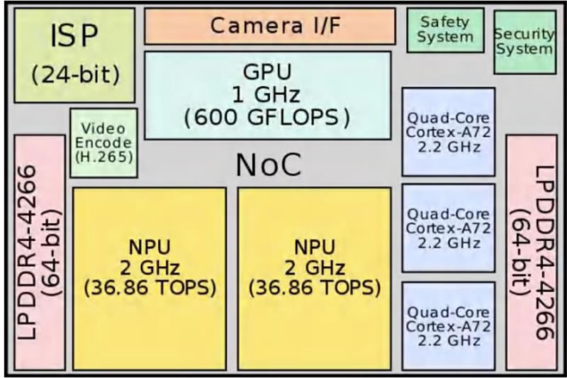 層出發(fā)為自動駕駛和深度神經(jīng)網(wǎng)絡(luò)鎖設(shè)計的芯片,CPU做控制,GPU做圖像處理,NPU為神經(jīng)處理單元,
