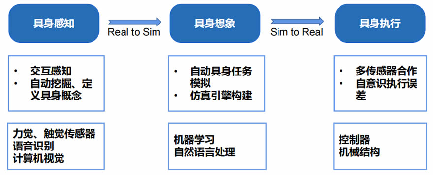 具身智能包含具身感知、具身想象和具身執(zhí)行三個模塊,涉及機器人學(xué)、計算機視覺、認(rèn)
