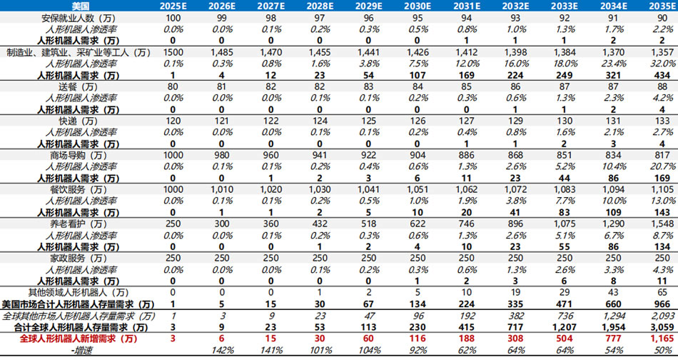 出生率下降、人力成本抬升,人形機(jī)器人空間廣闊。我們按照美國(guó)的安保、D二產(chǎn)業(yè)、送餐、快遞、商場(chǎng)