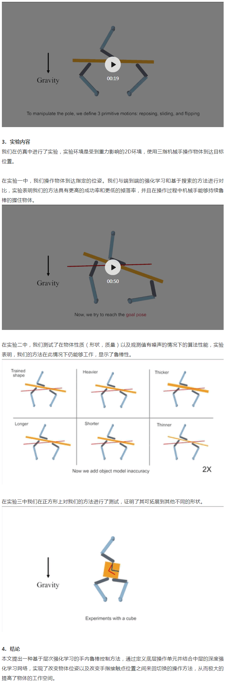 傳統(tǒng)上,手內(nèi)操作有兩類解決方案,一類是基于模型的方法(model-based method),通過對抓取的動(dòng)力學(xué)建模,來控制手指移動(dòng)帶動(dòng)物體姿態(tài)。這種辦法好處在于穩(wěn)定性強(qiáng),模型簡單,但問題在于難以實(shí)現(xiàn)較長和復(fù)雜的手內(nèi)操作流程,特別是目標(biāo)位姿和起始位姿相距很遠(yuǎn)的情況,因?yàn)樗鼈兒茈y規(guī)劃手指接觸點(diǎn)的移動(dòng);另一類方法是無模型方法(model-free method),通常使用深度強(qiáng)化學(xué)習(xí)的方法。這類方法優(yōu)點(diǎn)在于不需要系統(tǒng)模型,但缺點(diǎn)在于穩(wěn)定性差,并且需要大量數(shù)據(jù)進(jìn)行訓(xùn)練。而我們的方法結(jié)合了這兩種方法:在底層使用傳統(tǒng)的動(dòng)力學(xué)建模方式保持穩(wěn)定的抓取和實(shí)現(xiàn)簡單基本的操作單元,在中層通過深度強(qiáng)化學(xué)習(xí)來進(jìn)行規(guī)劃,選擇不同的操作單元,終實(shí)現(xiàn)穩(wěn)定且復(fù)雜的操作流程。我們的方法結(jié)合了兩種方法的優(yōu)點(diǎn):在底層通過使用基于模型的操作單元,保證了手指與物體之間持續(xù)穩(wěn)定的抓;在中層使用強(qiáng)化學(xué)習(xí)進(jìn)行規(guī)劃,從而實(shí)現(xiàn)較長和復(fù)雜的手內(nèi)操作流程。