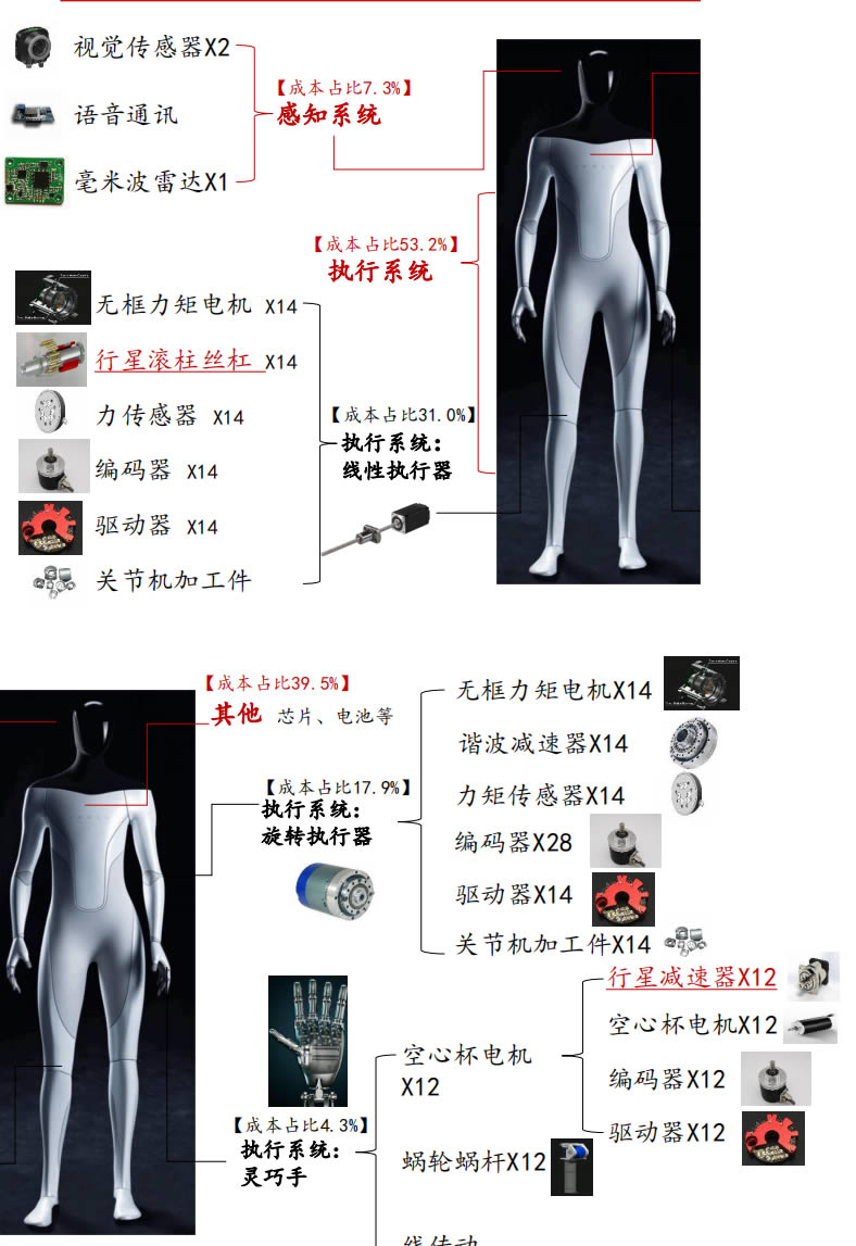 執(zhí)行系統(tǒng)BOM占比G,約53.2%(其中直線、旋轉、手部分別 占31.0%、17.9%、4.3%);感知系統(tǒng)占7.3%,其他芯片、電池等部件合計占比39.5%
