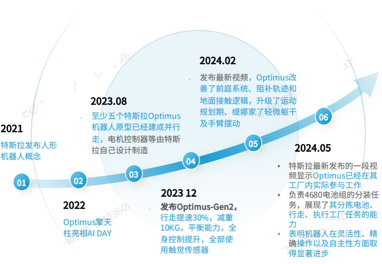 2023 年 特斯拉發(fā)布Optimus-Gen2演示視頻, 其運(yùn)動(dòng)能力、平衡性與感知能力進(jìn)—步提升,能夠?qū)崿F(xiàn)二指拿雞蛋等動(dòng)作,指尖觸覺傳感器與足部力傳感器的應(yīng)用成為核心亮點(diǎn)。特斯拉人形機(jī)器人目前放在特斯拉汽車工宇進(jìn)行實(shí)用性測試優(yōu)化,馬 斯克在2023第四季度業(yè)績交流會(huì)提出2025年實(shí)現(xiàn)人形機(jī)器人部分交付,將持續(xù)推動(dòng)商業(yè)化落地。
