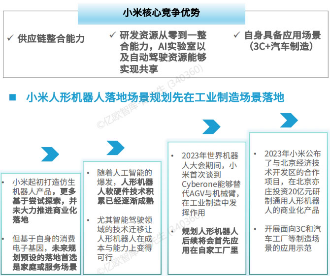小米制造人形機(jī)器人的初衷背后主要是由于小米自2017年起就采取了“先確索后賦能” 的研發(fā)路徑,希望不斷通過(guò)自身的實(shí)踐先行—步,為產(chǎn)業(yè)鏈 賦能。由于其本身有著自己的龐大的生產(chǎn)任務(wù),從而希望人形機(jī)器人在3C和汽車制造L域,替代部分現(xiàn)在工業(yè)機(jī)器人無(wú)法模成的工作。
