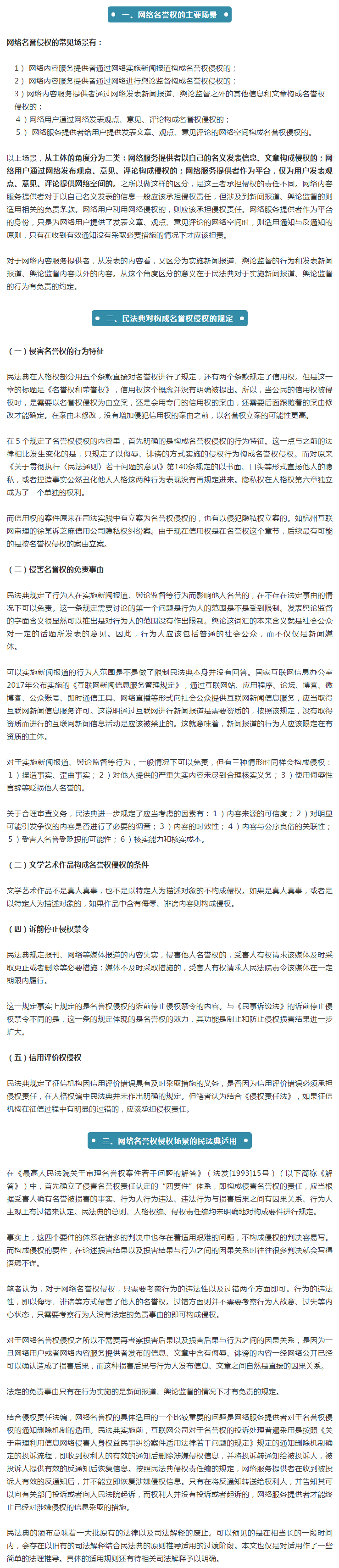 《中華人民共和國民法典》經(jīng)十三屆全國人大三次會議審議通過,這是新中國D一部以“法典”命名的大法。民法典的亮點之一是人格權(quán)的獨立成編,亮點二是諸多的互聯(lián)網(wǎng)條款的規(guī)定,使得這部法典呈現(xiàn)了鮮明的互聯(lián)網(wǎng)時代的印記。作為這兩個亮點疊加下的網(wǎng)絡(luò)名譽侵權(quán)也是民法典頒布后倍受關(guān)注的條款。