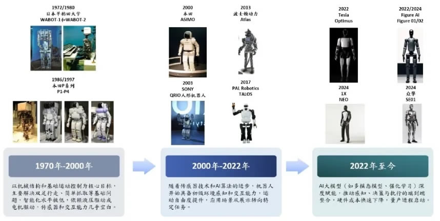 人形機(jī)器人技術(shù)的探索歷程可追溯至20世紀(jì)中期。1972年,日本早稻田大學(xué) 研發(fā)出世界上D一款全尺寸人形智能機(jī)器人WABOT-1, 開(kāi)啟了人形機(jī)器人技術(shù) 的先河。1990年代,隨著研究方向的創(chuàng)新以及控制方法、人工智能等L域的突 破,人形機(jī)器人技術(shù)迎來(lái)了快速發(fā)展期。2000年,本田推出ASIMO 機(jī) 器 人 , 其運(yùn)行功能的逐步完善標(biāo)志著人形機(jī)器人技術(shù)邁上了新的臺(tái)階。此后,人形機(jī) 器人在環(huán)境感知、決策、學(xué)習(xí)和運(yùn)動(dòng)控制等方面不斷迭代升級(jí),性能顯著提 升。2018年,本田因市場(chǎng)需求、業(yè)務(wù)調(diào)整等因素宣布停止ASIMO 的研發(fā)。 2020年軟銀旗下的D機(jī)器人技術(shù)公司波士頓動(dòng)力出售給韓國(guó)現(xiàn)代汽車(chē)集 團(tuán),收購(gòu)作價(jià)為11億美元,估值相比2013年谷歌收購(gòu)波士頓動(dòng)力時(shí)的30億美 元下降了約63%。然而,行業(yè)技術(shù)發(fā)展的腳步并未停滯。2022年,特斯拉推出 Optimus 機(jī)器人,引L了新一輪人形機(jī)器人的研發(fā)熱潮。與此同時(shí),人工智能 的快速進(jìn)步為人形機(jī)器人的研發(fā)注入了新的動(dòng)力。