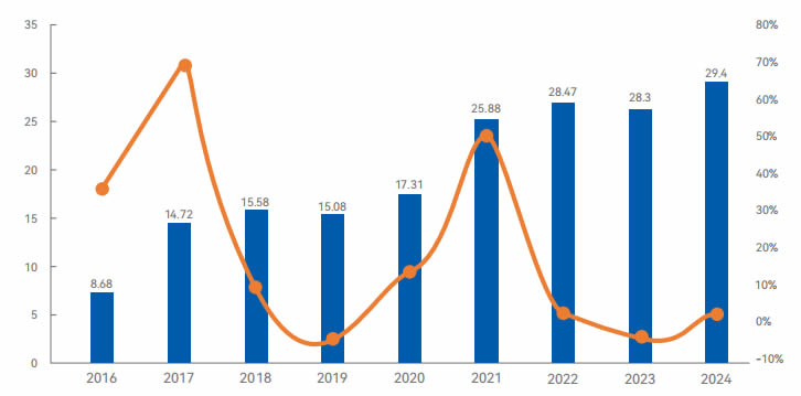 2024年全年,ZG工業(yè)機(jī)器人市場銷量超29.4萬臺。盡管受整體制造業(yè)企業(yè)生產(chǎn)預(yù)期下降、市場需求收縮等因素影響,工業(yè) 機(jī)器人面臨著一系列的增長壓力,市場仍處于去庫存和行業(yè)淘汰賽的關(guān)鍵階段,但同比2023年仍實(shí)現(xiàn)3.9%的微增。