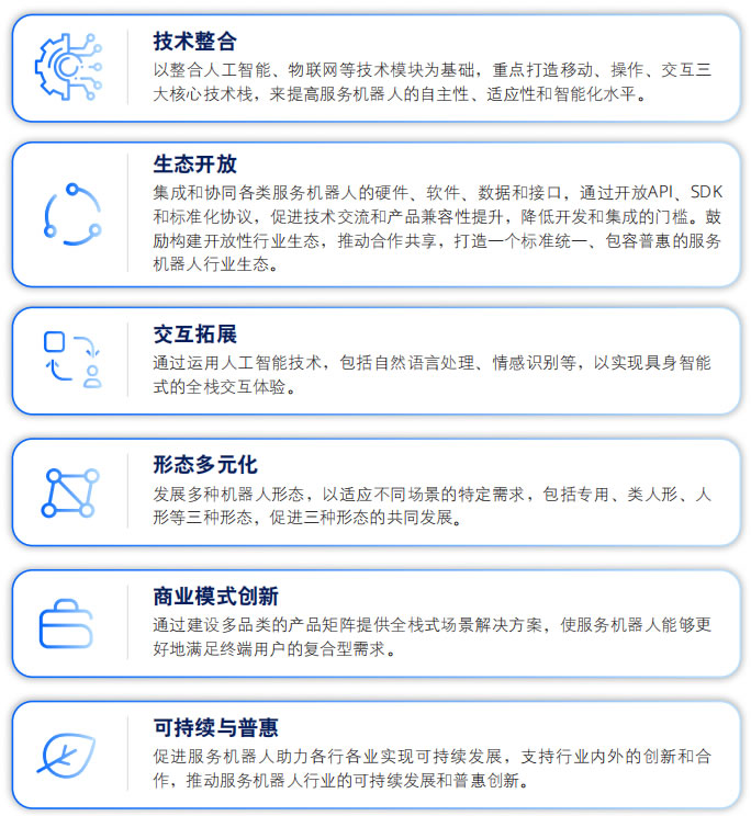 開放性的全棧式智能服務(wù)機(jī)器人生態(tài)是一個(gè)技術(shù)框架和商業(yè)模式的創(chuàng)新綜合體,旨在通過以AI為 核心的多技術(shù)棧和創(chuàng)新的商業(yè)模式,建立開放普 惠的行業(yè)生態(tài),實(shí)現(xiàn)服務(wù)機(jī)器人與一切可能的交 互對(duì)象(包括人、環(huán)境、其他機(jī)器人和軟硬件系 統(tǒng))之間的智能交互與萬物互聯(lián),形成一個(gè)通用 的全棧式智能機(jī)器人體系。該生態(tài)的核心理念在 于開放性和通用性,通過構(gòu)建一個(gè)多面互通、無縫銜接的智能服務(wù)機(jī)器人生態(tài),來實(shí)現(xiàn)服務(wù)機(jī)器人在多樣化應(yīng)用場(chǎng)景中的深度融合和廣泛應(yīng)用。