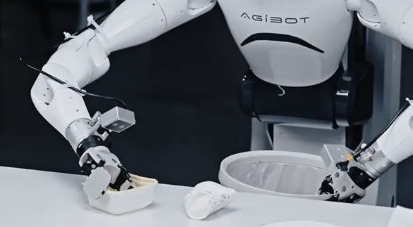 2)視覺+觸覺下,靈巧手準確執(zhí)行酒杯和酒瓶的抓握,雙臂+雙手協(xié)同完成倒酒操作。 同樣在家用場景中,智元機器人可實現(xiàn)一手將日用品放入被另一只手提著的手提袋內(nèi), 協(xié)同效應較好;同時,揀取桌面不同位置的垃圾并置于垃圾桶中。