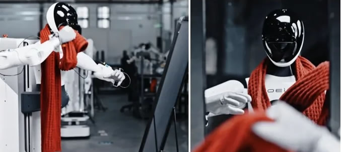1)機器人保持動作柔順性與位姿穩(wěn)定性,雙手靈巧配合,可以完成具有生物運動特征的圍巾佩戴任務,先模型通過觀察鏡子中圍巾和頭的相對位置,完成圍巾的初始佩戴, 然后根據(jù)兩側的長度比例,左手準確的握住需要調(diào)整的一端,將其拉到適當?shù)奈恢,? 后右手接過左手遞過來的圍巾執(zhí)行“圍”的螺旋纏繞動作。