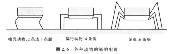 因為腿式機器人的發(fā)明是受到生物學上的啟發(fā),所以檢驗一下生物學上成功的 有腿系統(tǒng)是有益的。許多不同的腿的構(gòu)造已經(jīng)在各種各樣的生物體中成功地存在 (圖2.6)。大型動物,如哺乳動物和爬行動物有4條腿,而昆蟲有6條腿或更多。某 些哺乳動物,僅靠2條腿行走的能力已經(jīng)很出色。尤其是人類,平衡能力已經(jīng)進展到 甚至可用單腿進行跳躍的水平①。這種異常的機動性是以很高代價得來的:為保持平 衡而使用更復雜的主動控制 。