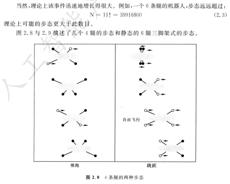 對于多腿移動機器人,存在運動時腿的協(xié)調(diào)或步態(tài)控制問題。可能的步態(tài)數(shù)目 依賴于腿的數(shù)目[52]。對單條腿而言,步態(tài)是抬起與放下事件的序列。對一個有 k 條 腿的移動機器人,步行機器可能事件的總數(shù)N 為