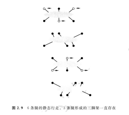 相反,3條腿的動物假定它能保證其重心處在地面接觸的三腳區(qū)內(nèi),它就能夠展 示靜止、穩(wěn)定的姿態(tài)。如3條腿的凳子所展現(xiàn)那樣,靜止穩(wěn)定性意味著不需要運動而 保持平衡。在沒有傾覆力時,稍微偏離穩(wěn)定(比如輕輕推凳子)會被動地予以校正而 趨向穩(wěn)定的姿態(tài)。 但是為了行走,機器人需要能夠抬腿。為了能達到靜態(tài)行走,機器人至少要有4 條腿,一次移動一個。而對于6條腿的情況,就有可能設(shè)計出一種步態(tài),按此,腿的靜 態(tài)穩(wěn)定三腳區(qū)總是與地面接觸(圖2.9)。