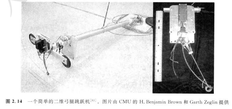 圖2.14表示的是Z近研制開發(fā)的更高效能的結(jié)構(gòu)[83,它利用了設(shè)計(jì)良好的機(jī)械 動力學(xué)83。它不用外裝的液壓泵供給能量,而是設(shè)計(jì)了弓腿跳躍機(jī),當(dāng)它著地時,利 用一根有效的弓形彈簧腿來獲得機(jī)器人的動能。這個彈簧返回了幾乎85%的能量, 這就意味著每次只需要添加所需能量的15%即可穩(wěn)定跳躍。這個機(jī)器人用支架沿軸 受到約束,用裝在機(jī)器人上的一組電池,已經(jīng)展示能連續(xù)跳躍20 min 。和 Raibert 跳 躍機(jī)一樣,弓腿跳躍機(jī)通過在髖關(guān)節(jié)改變相對于身體的腿角來控制速度。