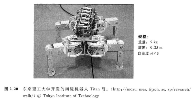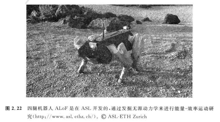 另一個(gè)四腿機(jī)器人的例子是ALoF, 該機(jī)器人是在ASL(蘇黎世瑞士聯(lián)邦理工大學(xué))開(kāi) 發(fā)的(圖2.22)。它被當(dāng)作一個(gè)平臺(tái),研究能量-效率運(yùn)動(dòng)。這是通過(guò)發(fā)掘無(wú)源動(dòng)力學(xué)來(lái)進(jìn) 行的,其方法如同2.2.2節(jié)所闡述的一樣,它在雙腳機(jī)器人中被證明是有效的。
