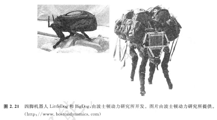 BigDog 和LittleDog(圖2.21)是四腳機(jī)器人的Z新例子,它們是受美國(guó)國(guó)防先 進(jìn)研究項(xiàng)目局(DARPA) 委托,由波士頓動(dòng)力研究所開(kāi)發(fā)的機(jī)器人。BigDog是一個(gè) 粗糙地形的機(jī)器人,能夠走、跑、爬,并運(yùn)載重負(fù)荷。它由一個(gè)發(fā)動(dòng)機(jī)和驅(qū)動(dòng)液壓激勵(lì)系統(tǒng)提供動(dòng)力。它的腿像動(dòng)物一樣與適從元件相連,吸收振動(dòng),并在二步之間循環(huán)能 量。該項(xiàng)目的目的,是使機(jī)器人能夠去人和動(dòng)物能夠去的任何地方。這個(gè)項(xiàng)目由 DARPA 的戰(zhàn)術(shù)技術(shù)辦公室資助。相反,LittleDog是一個(gè)小尺寸的機(jī)器人,它是為研究學(xué)習(xí)運(yùn)動(dòng)而設(shè)計(jì)的。它的每條腿具有大的運(yùn)動(dòng)范圍,并由3個(gè)電機(jī)供能量。所以, 這個(gè)機(jī)器人在爬行和動(dòng)態(tài)運(yùn)動(dòng)步態(tài)方面,具有足夠強(qiáng)的功能。
