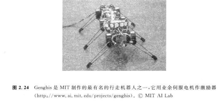 臀部彎曲、膝蓋彎曲和臀部外展(圖2.7)。Genghis 是一個(gè)商業(yè)上已可用的有6條腿 的業(yè)余機(jī)器人,各腿有業(yè)余伺服電機(jī)所提供的2個(gè)自由度(圖2.24)。這樣的機(jī)器人 僅由臀部彎曲和臀部外展組成,在粗糙的地形中機(jī)動(dòng)性較差,但在平地上則表現(xiàn)很 好。因?yàn)樗怯芍蓖群退欧姍C(jī)簡(jiǎn)捷裝配而成,所以機(jī)器人業(yè)余愛好者可以很容易 地制作這種機(jī)器人。