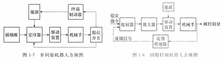 伺服控制機(jī)器人(servo-controlled robot)比非伺服機(jī)器人有更強(qiáng)的工作能力,因而價(jià)格較貴,但在某些情況下不如簡單的機(jī)器人可靠。圖1-8表示伺服控制機(jī)器人的方塊圖。 伺服系統(tǒng)的被控制量(輸出)可為機(jī)器人端部執(zhí)行裝置(或工具)的位置、速度、加速度和力 等。通過反饋傳感器取得的反饋信號(hào)與來自給定裝置(如給定電位器)的綜合信號(hào),用比較器加以比較后,得到誤差信號(hào),經(jīng)過放大后用以激發(fā)機(jī)器人的驅(qū)動(dòng)裝置,進(jìn)而帶動(dòng)末端執(zhí) 行裝置以一定規(guī)律運(yùn)動(dòng),到達(dá)規(guī)定的位置或速度等。顯然,這就是一個(gè)反饋控制系統(tǒng)。