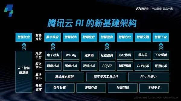 基于騰訊云、企業(yè)微信等社交連接工具,騰訊布局AI新基建全景。騰訊云AI新基建整體布局為“一云三平臺”架構。一云是騰訊云,三平臺包括算法平臺、服務平臺以及開放平臺。
