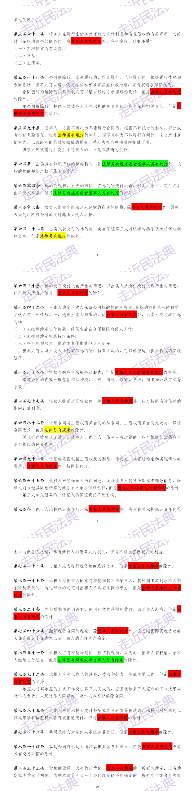 我們應(yīng)當(dāng)注意到,《民法典》之外,還有大量的民法規(guī)范與制度沒有寫進(jìn)來,甚至其他非民事法律中也涉及了民事法律內(nèi)容,這也導(dǎo)致了在《民法典》中,有很多“法律另有規(guī)定除外”條款的存在。此外,基于民法基本原則之一的“意思自治原則”,《民法典》尤其合同編中有很多“當(dāng)事人另有約定的除外”條款。當(dāng)然,也存在二者并存的即“法律另有規(guī)定或當(dāng)事人另有約定除外”的條款。