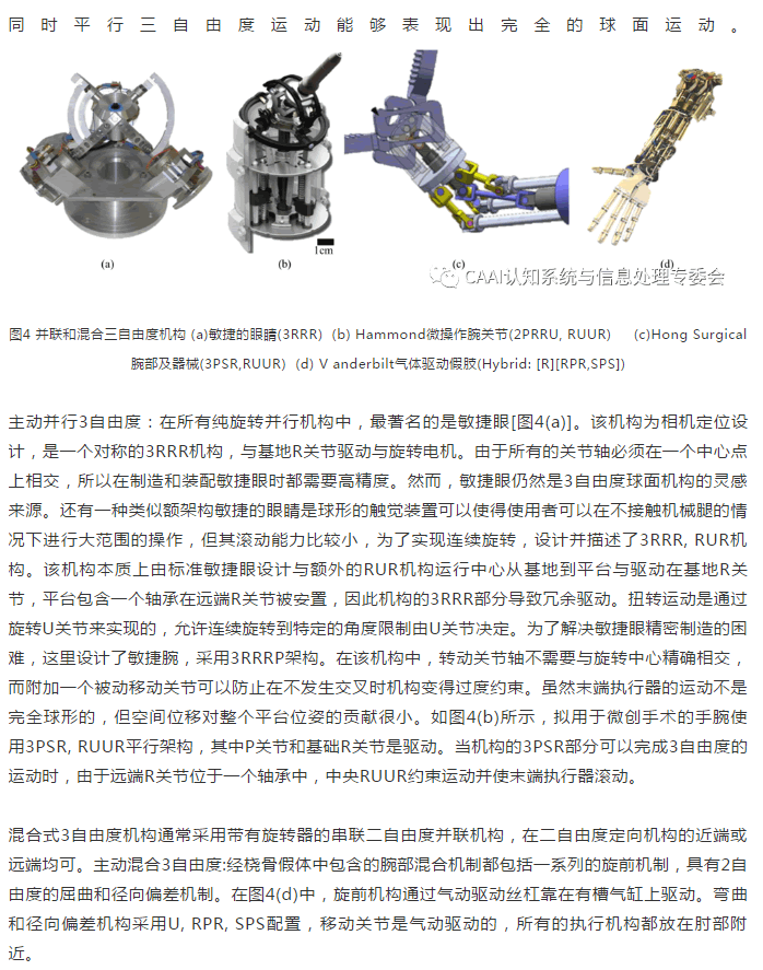 串行RRR方法在工業(yè)機(jī)械臂應(yīng)用中非常普遍。許多商用工業(yè)武器,如Kuka k -16、川崎k系列、發(fā)那科M系列、DurrEcoPaint、鴻海/ Foxconnrobot arms和巴雷特WAM[圖2(b)]。這三個(gè)關(guān)節(jié)的軸在一個(gè)共同點(diǎn)上相交球形末端執(zhí)行器運(yùn)動(dòng),并為機(jī)器人手臂更近端的關(guān)節(jié)提供平移運(yùn)動(dòng)與球形手腕運(yùn)動(dòng)解耦。當(dāng)兩個(gè)“滾”軸共線時(shí),這種設(shè)計(jì)常常導(dǎo)致在零位置出現(xiàn)奇異點(diǎn)。然而,在包裝約束的運(yùn)動(dòng)范圍和靈活性(輥電機(jī)和齒輪系可以放置遠(yuǎn)離旋轉(zhuǎn)中心)使這種配置吸引和適合工業(yè)武器。要注意的是,這些臂內(nèi)的俯仰和其中一個(gè)滾轉(zhuǎn)角通常是通過傘齒輪差速器驅(qū)動(dòng)的,這使得電機(jī)可以沿著腕關(guān)節(jié)的縱向放置,節(jié)省空間,并可能減少轉(zhuǎn)動(dòng)慣量。滾-槳-滾設(shè)計(jì)也用于類人機(jī)器人、用于衛(wèi)星服務(wù)的機(jī)器人手臂和外科機(jī)器人手腕,代替使用D二列滾動(dòng)關(guān)節(jié),一些手腕設(shè)計(jì)實(shí)現(xiàn)3自由度的運(yùn)動(dòng)通過滾動(dòng)-傾斜-偏航配置。在這種情況下,偏航軸垂直于橫搖軸和俯仰軸,對(duì)應(yīng)于人手腕的徑向偏差。當(dāng)偏航軸與俯仰軸和滾轉(zhuǎn)軸相交時(shí),該機(jī)構(gòu)通常被認(rèn)為是一個(gè)球形腕關(guān)節(jié),也可以被認(rèn)為是一個(gè)RU鏈。除了手術(shù)臂和工業(yè)臂,因?yàn)闈L-滾-滾手腕與人的手腕相似,所以也經(jīng)常用于人形或擬人化機(jī)械臂。一些系列腕設(shè)計(jì)選擇使用單一的球關(guān)節(jié)而不是串行鏈,雖然整體幾何形狀是一個(gè)球和窩接接頭,但球?qū)嶋H上是轉(zhuǎn)子,窩接接頭是定子。