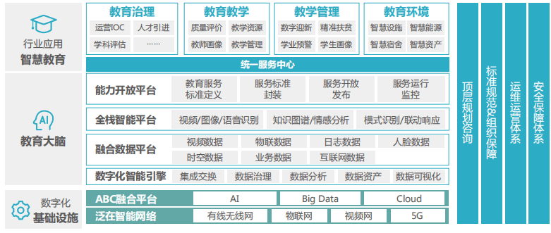 “2”指的是數(shù)字化基礎(chǔ)設(shè)施,包含校園的泛在智能網(wǎng)絡(luò)和ABC融合平臺。校園泛在智能網(wǎng)絡(luò)實現(xiàn)有線無線網(wǎng)、物聯(lián)