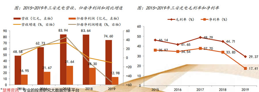 公司是LED芯片龍頭,重點(diǎn)投資Ⅲ-Ⅴ族化合物半導(dǎo)體,子公司三安集成2019年實(shí)現(xiàn)銷售收入 2.41 億元,同比增長 40.67%。砷化鎵射頻出貨客戶累計(jì)超過 90 家,客戶地區(qū)涵蓋國內(nèi)外;氮 化鎵射頻產(chǎn)品重要客戶已實(shí)現(xiàn)批量生產(chǎn),產(chǎn)能正逐步爬坡;電力電子產(chǎn)品推出的G功率密度碳化 硅功率二J管及 MOSFET 及硅基氮化鎵功率器件主要應(yīng)用于新能源汽車、充電樁、光伏逆變器等 電源市場,客戶累計(jì)超過 60 家,27種產(chǎn)品已進(jìn)入批量量產(chǎn)階段;光通訊業(yè)務(wù)產(chǎn)品主要應(yīng)用于光 纖到戶,5G 通信基站傳輸及消費(fèi)類終端的3D感知探測等應(yīng)用市場,光通訊在保持及擴(kuò)大現(xiàn)有中 低速 PD/MPD 產(chǎn)品的市場L先份額外,在附加值G的G端產(chǎn)品如 10G APD/25G PD、以及發(fā)射端 10G/25G VCSEL 和 10G DFB 均已在行業(yè)重要客戶處實(shí)現(xiàn)驗(yàn)證通過,進(jìn)入實(shí)質(zhì)性批量試產(chǎn)階段; 濾波器產(chǎn)品開發(fā)性能優(yōu)越,生產(chǎn)線持續(xù)擴(kuò)充及備貨中,預(yù)計(jì) 2020 年會實(shí)現(xiàn)銷售。