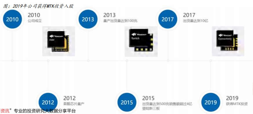 公司以射頻開關(guān)、LNA芯片起家,實(shí)現(xiàn) L先手機(jī)品牌如三星、小米、華為、vivo、OPPO等重點(diǎn)客戶覆蓋,并在2019年實(shí)現(xiàn)射 頻模組產(chǎn)品從無到有的突破。在細(xì)分產(chǎn)品中,比較優(yōu)勢明顯,射頻開關(guān)已通過G通的小批 量試產(chǎn)驗(yàn)證,正式進(jìn)入量產(chǎn)。DiFEM的成功研制是公司技術(shù)創(chuàng)新的又一里程 碑,打破了海外寡頭在射頻模組L域的壟斷局勢。站在當(dāng)前時點(diǎn),公司營收體量小,所處 賽道面向250億美元市場,具備5G換機(jī)潮和射頻芯片國產(chǎn)替代的雙重彈性。