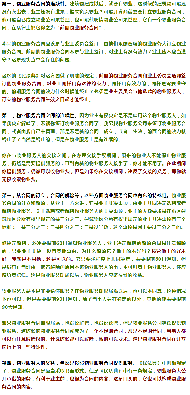 物業(yè)服務(wù)是隨著我們城市化的發(fā)展,居民小區(qū)的公共服務(wù)需要而產(chǎn)生的。物業(yè)服務(wù)合同它是在委托合同這一章后,它從合同標(biāo)的上來講,跟委托合同的標(biāo)的是類似的,都屬于提供勞務(wù)類的!睹穹ǖ洌ú莅福樊(dāng)中曾經(jīng)規(guī)定,物業(yè)合同沒有規(guī)定的,參照適用委托合同的規(guī)定。曾經(jīng)有這條規(guī)定,但是后來沒有了,它還是有很大的差別,但是從提供勞務(wù)服務(wù)的標(biāo)的上來講,它們是屬于同一類服務(wù)合同。