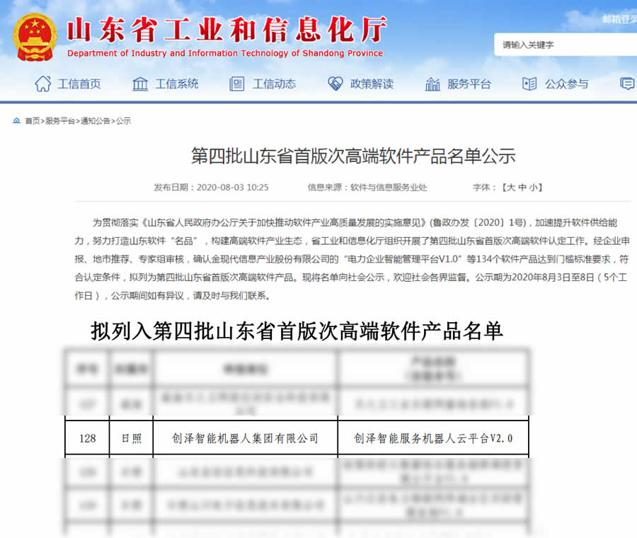 近日,省工業(yè)和信息化廳發(fā)布《山東省首版次G端軟件(第四批)公示名單》,創(chuàng)澤集團自主研發(fā)的“創(chuàng)澤智能服務機器人云平臺V2.0”等軟件產品成功入選。截至目前,創(chuàng)澤集團共有多款產品榮獲山東省首版次G端軟件產品。