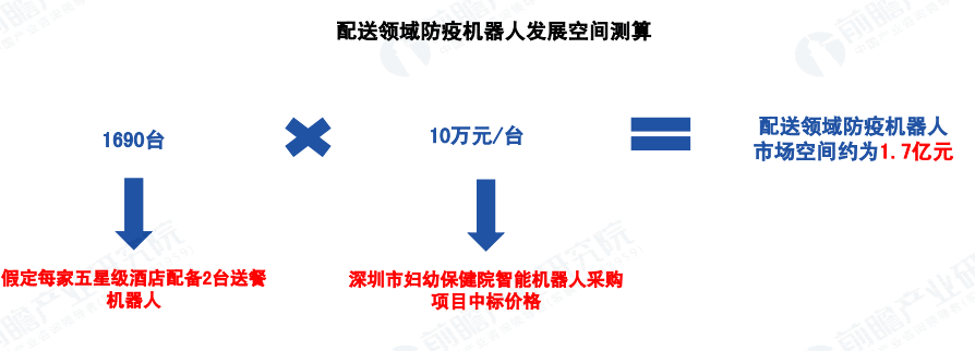 酒店場景下的初始客戶主要為G檔酒店,假設(shè)全國每一家五星級酒店均配備2臺送餐機器人,按照平均每臺10萬元的價格計算,酒店服務(wù)場景下,防疫機器人的市場空間約為1.7億元。