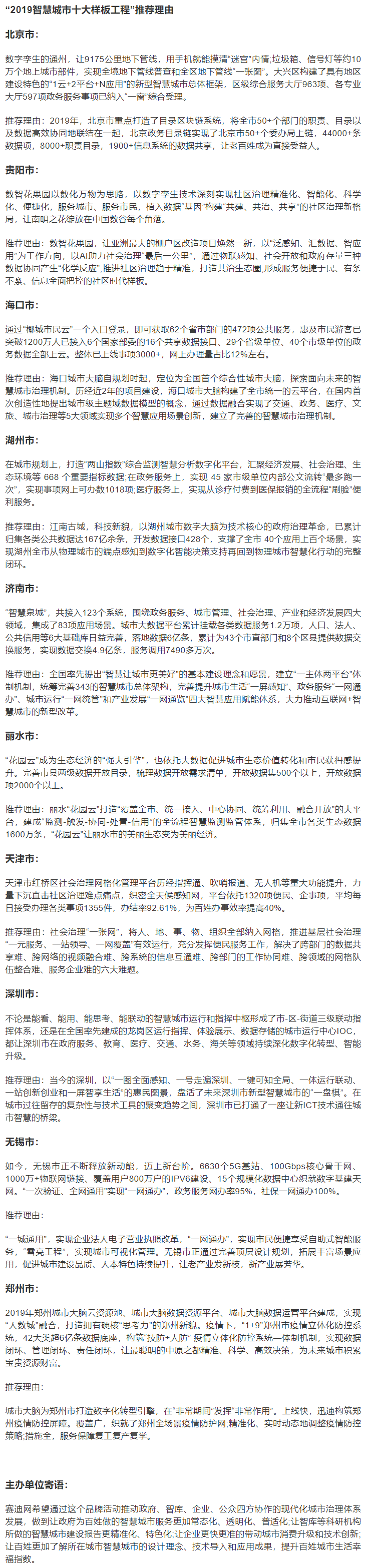 終北京市、貴陽市、?谑、湖州市、濟南市、麗水市、天津市、深圳市、無錫市、鄭州市十座城市,以優(yōu)秀的城市建設經驗、切實的城市運營數據和G口碑的市民反饋,被評為“2019智慧城市十大樣板工程”。