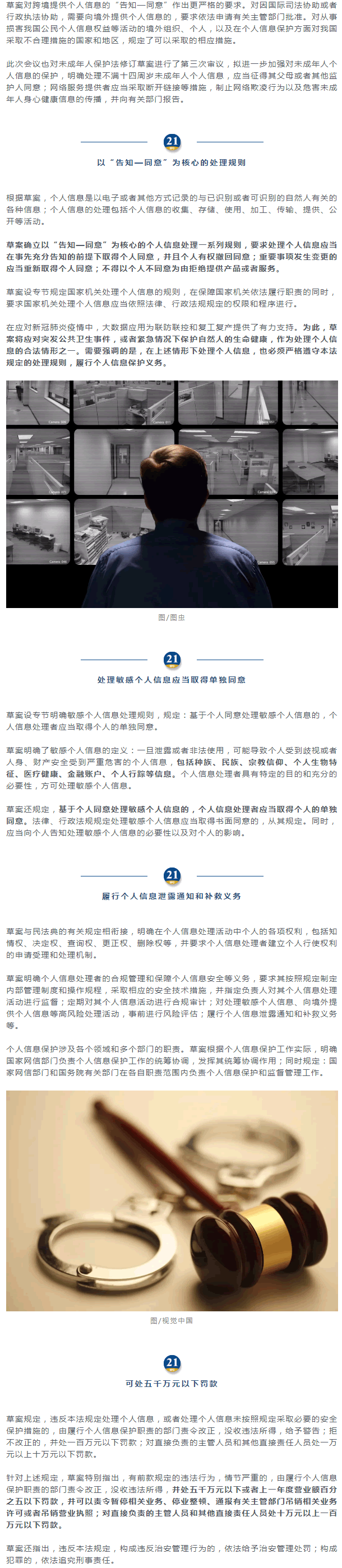 據(jù)介紹,草案共八章70條,明確了適用范圍,健全了個人信息處理規(guī)則,完善了個人信息跨境提供規(guī)則,明確個人信息處理活動中個人的權(quán)利和處理者義務(wù),并明確履行個人信息保護(hù)職責(zé)的部門。