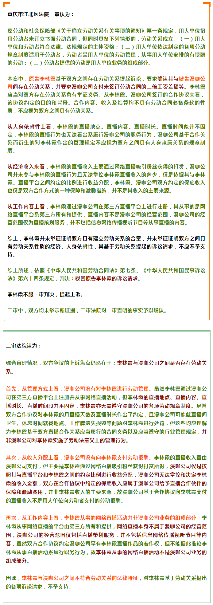 案例要旨:網(wǎng)絡(luò)主播與合作公司簽訂藝人d合作協(xié)議,通過(guò)合作公司包裝推薦,自行在第三方直播平臺(tái)上注冊(cè),從事網(wǎng)絡(luò)直播活動(dòng),并按合作協(xié)議獲取直播收入。因合作公司沒(méi)有對(duì)網(wǎng)絡(luò)主播實(shí)施具有人身隸屬性的勞動(dòng)管理行為,網(wǎng)絡(luò)主播從事的直播活動(dòng)并非合作公司的業(yè)務(wù)組成部分,其基于合作協(xié)議獲得的直播收入亦不是勞動(dòng)法意義上的具有經(jīng)濟(jì)從屬性的勞動(dòng)報(bào)酬。因此,二者不符合勞動(dòng)關(guān)系的法律特征,網(wǎng)絡(luò)主播基于勞動(dòng)關(guān)系提出的各項(xiàng)訴訟請(qǐng)求,不應(yīng)予以支持。