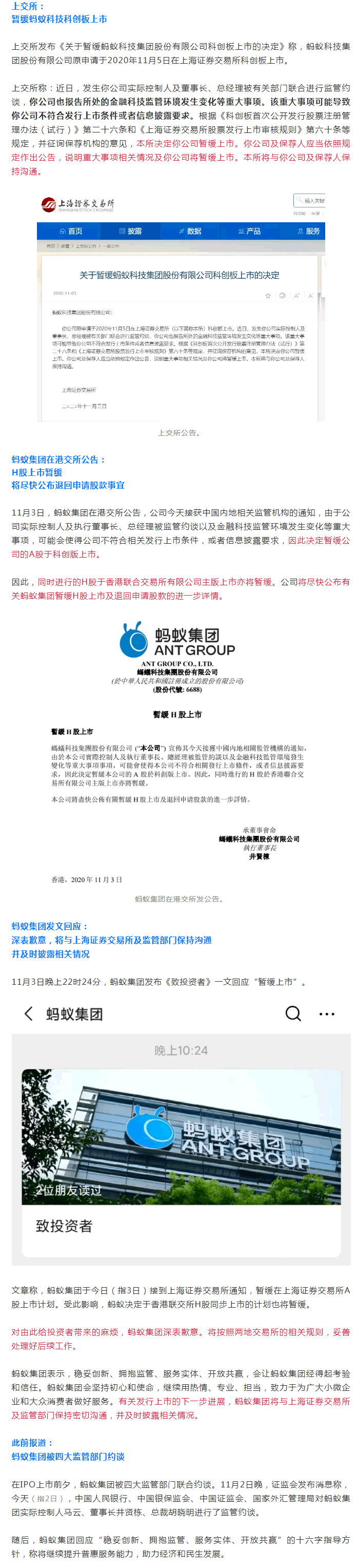 11月3日晚間,上交所公告稱,暫緩螞蟻科技集團(tuán)股份有限公司科創(chuàng)板上市。隨后,螞蟻集團(tuán)在港交所發(fā)布公告,同時(shí)進(jìn)行的H股于香港聯(lián)合交易所有限公司主版上市亦將暫緩。