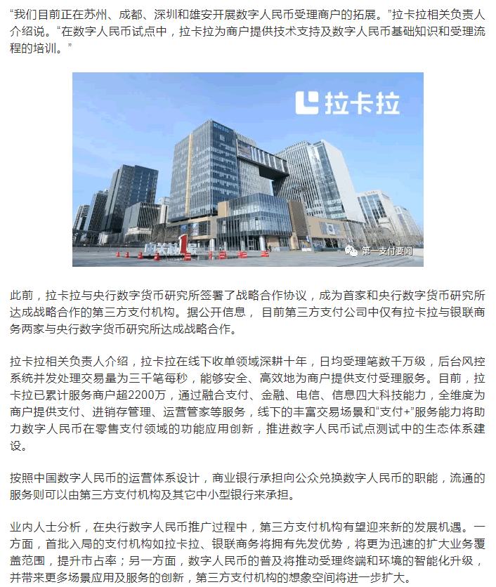 據(jù)了解,作為首家開(kāi)通數(shù)字人民幣受理服務(wù)的支付機(jī)構(gòu),此次拉卡拉參與蘇州雙十二活動(dòng)的商戶門(mén)店數(shù)近千家,包括全國(guó)知名連鎖藥店,商超,化妝品店,餐飲店,酒店,連鎖美甲店,汽配店等。此次蘇州數(shù)字人民幣消費(fèi)紅包測(cè)試支持掃一掃、碰一碰(雙離線)等非接觸支付方式。